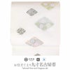届いて直ぐに使える夏用のお仕立て上がりの名古屋帯です。 京都西陣で織り上げられ、西陣織の証紙が付いた品質確かな逸品。 白地に金やピンク、ブルーで菱型を織り込み、その中にお花や流水を織り込んだ上品な名古屋帯です。 色無地から小紋に合わせて頂けます。 帯地に織り込んだ銀糸が動きによって煌めきより優雅さが際立ちます。 色無地に合わせてお茶会に出かけたり、お友達との気軽なお出掛けには小紋に合わせていかれると良いでしょう。 小物合わせは帯に織り込まれている色で合わせて頂くと上品な装いになります。 本商品は絹糸で織られ、しなやかで手触りも良く通気性に優れ、6月から8月までご使用できます。 柄もたれ先から前腹まで続いている柄付けですので、帯結びが苦手な方でも、着物初心者の方でも気軽に締めて頂ける商品です。