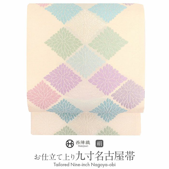 届いてすぐに使えるお仕立て上がりの九寸名古屋帯です。 京都西陣で織り上げられた、西陣証紙のついた確かな品質。 上品な帯ですのでコーディネートしやすく、 小紋や紬、色無地、街着などのカジュアル着物に最適です。 帯は伝統工芸の西陣織にて仕立てられており、染められた糸を複雑に織って模様を作るので、完成までに多数の工程があり、とても手間暇がかかる高級絹織物です。 細かく密度のある帯は、糸を豊富に使って丁寧に織られた証。 こうして織られた生地は、先染めしてから織っているので、一般的な染色法の後染めより丈夫でシワになりにくいのが特徴です。 絹の帯は光の当たり方で絹特有の柔らかな光沢が反射し、高級感あふれる美しい帯の質感がお楽しみいただけます。 しなやかな手触りと締め心地の良さを兼ね備え、正絹特有の柔らかな光沢をもつ逸品です。 仕立てはお太鼓結びのしやすい名古屋仕立てなので、帯結びが苦手な方でも締めやすく、お茶席やお稽古事にも最適な商品です。