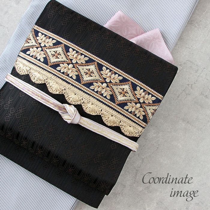 届いて直ぐに使えるお仕立て上がりの八寸名古屋帯です。 本場筑前博多織は、その締め心地のよさから多くのきもの愛好家に好まれているお品です。 本商品はキステオリジナルデザインで、独創的な柄付けと細やかな織りが自慢のワンランク上の作品です。 シックな黒の帯地には、落ち着きある茶色でアールデコ調の幾何学模様を細かく丁寧に織り上げてもらいました。目立ちすぎず、控えめ過ぎない絶妙なサイズの織柄は光の当たり具合で柄が浮かび上がり、大人の着こなしを上品に盛り上げてくれます。 お太鼓部分には、繊細な菱型模様やリーフ模様などの刺繍が施されたインド刺繍リボンをチョイス。所々に煌めくスパンコールも控えめながらとても印象的に光ります。 やや直線的でクールな雰囲気がメインだったデザインに、シャンパンゴールドの立体感のあるレースをあしらうことで柔らかさもプラス。かっこよさを持ちつつ、他にはない大人可愛いデザインに仕上がりました。 絹糸100%で織り上げているため、通気性や吸湿性に優れ、季節を問わずお使いいただけます。 本商品は開き仕立てになりますので、ご利用される方の身長や体格で前腹の幅を調整して頂ければ、よりバランス良くご着用して頂けます。 博多織独特の絹鳴りと正絹ならではの柔らかな光沢をもつ帯は、人と差がつく着姿を演出します。 観劇、芸術鑑賞、ショッピング、ちょっとしたお出掛け等幅広くご活用いただけます。 日常のお洒落に本場筑前博多織の帯をご堪能下さい。