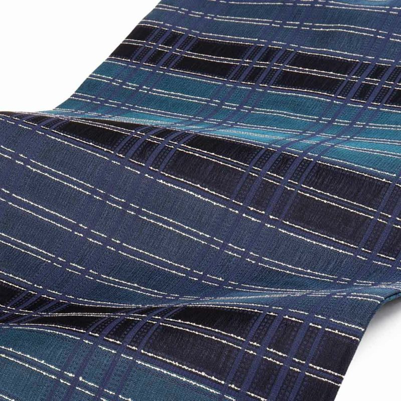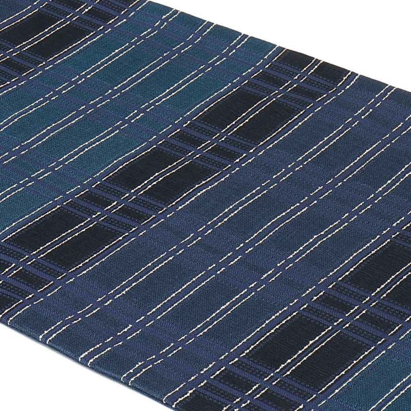 他の画像を見る 年中通して普段着や茶道 華道などのお稽古のお着物に 名古屋帯 博多帯 博多織 帯 八寸 オフホワイト 青 縞 菱 アラベスク菱 協和織工場 正絹 仕立て上がり 当店特別価格 ¥ 44,000 税込 在庫切れ 再入荷お知らせ お気に入りに登録する