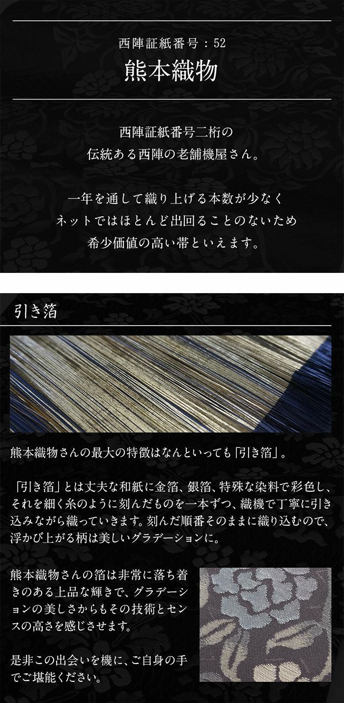 他の画像を見る 《お仕立て上り》【最短日お届け】黒留袖や色留袖、訪問着などのフォーマルなお着物に 袋帯 帯 礼装用 黒 青灰 グラデーション 唐花 浅田叡一 西陣織 仕立て上がり 新品 未使用 正絹 当店特別価格 ¥ 41,800 税込 カートに入れる お気に入りに登録する