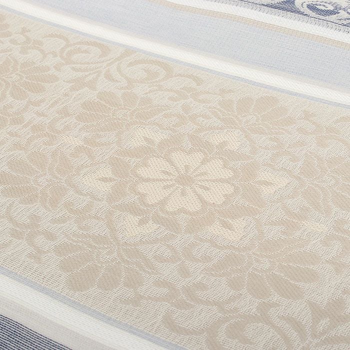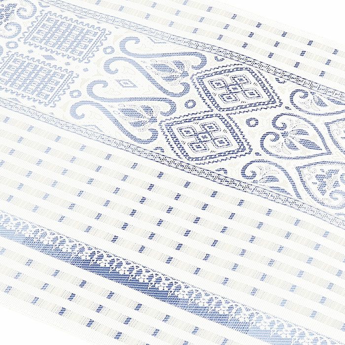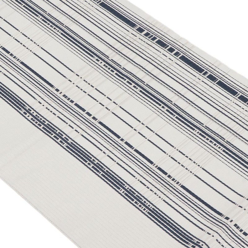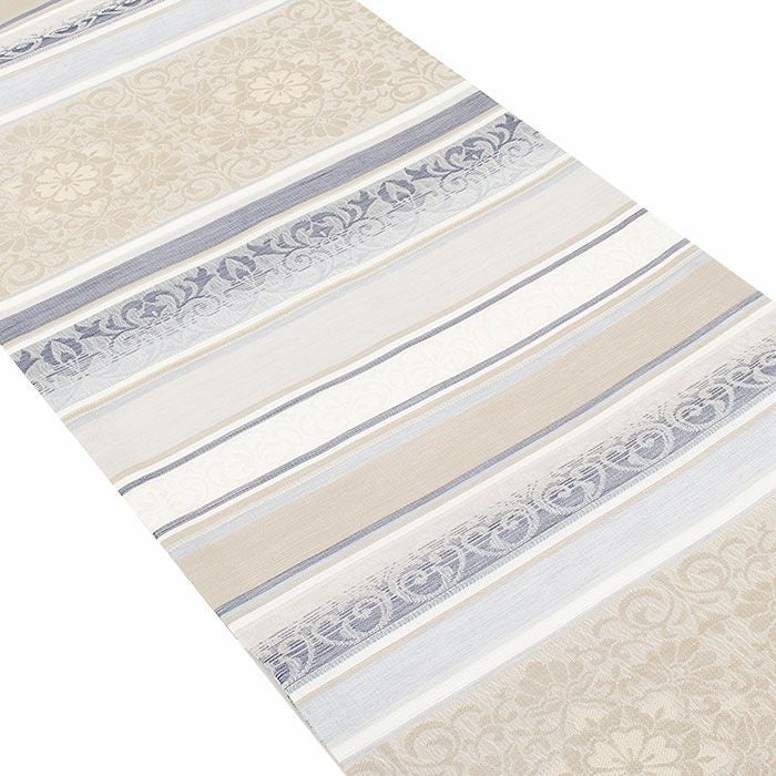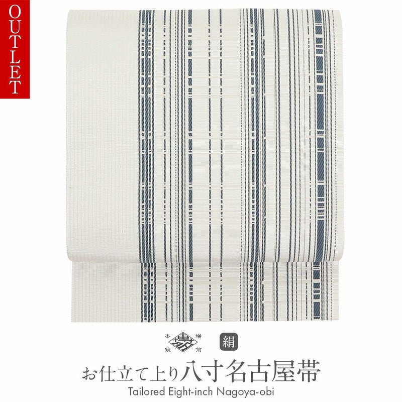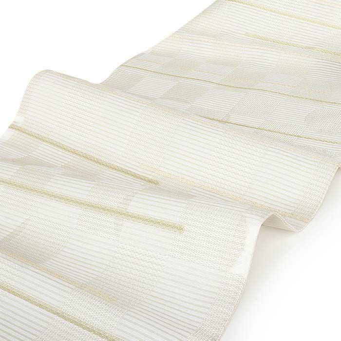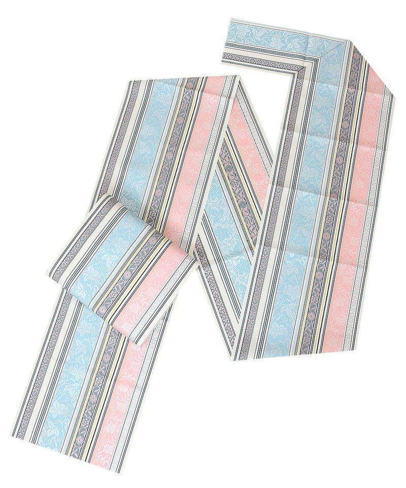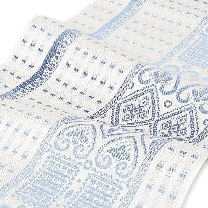 他の画像を見る 年中通して普段着や茶道 華道などのお稽古のお着物に 名古屋帯 博多帯 博多織 帯 八寸 オフホワイト 青 縞 菱 アラベスク菱 協和織工場 正絹 仕立て上がり 当店特別価格 ¥ 44,000 税込 在庫切れ 再入荷お知らせ お気に入りに登録する
