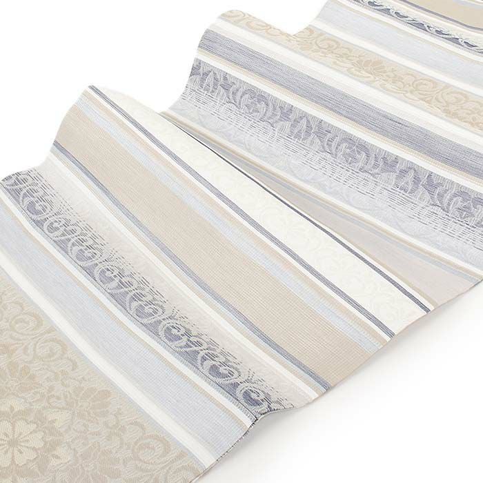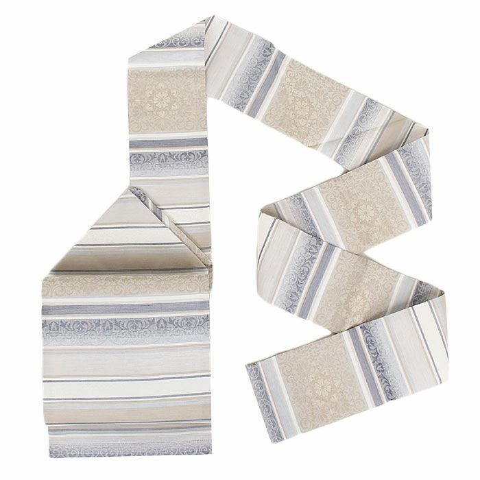 他の画像を見る 年中通して普段着や茶道 華道などのお稽古のお着物に 名古屋帯 博多帯 博多織 帯 八寸 グレージュ 縞 菱 アラベスク菱 協和織工場 正絹 仕立て上がり 当店特別価格 ¥ 44,000 税込 在庫切れ 再入荷お知らせ お気に入りに登録する