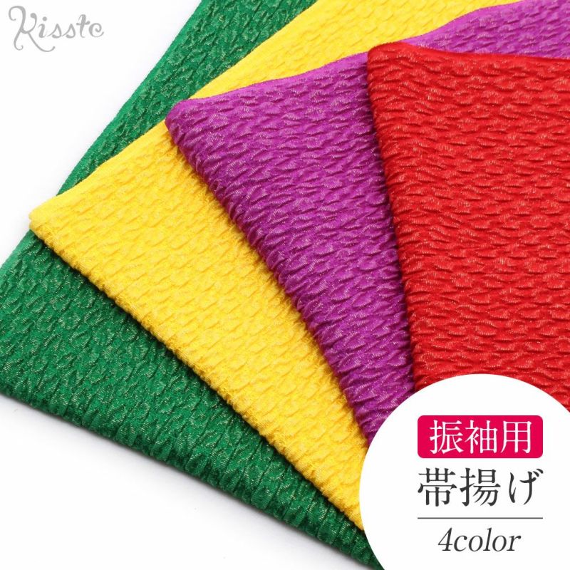 振袖の胸元を華やかに彩る、丹後ちりめんの正絹帯揚げです。 色鮮やかな地に細かく織り込まれた金糸が上品に煌き、立体感のある膨れ織はふっくらとした質感の仕上がり。 発色も良いのでコーディネートのアクセントに最適です。 振袖の華やかな装いはもちろん、個性的に普段着を楽しみたいときの アクセントにもお使い頂ける帯揚げです。