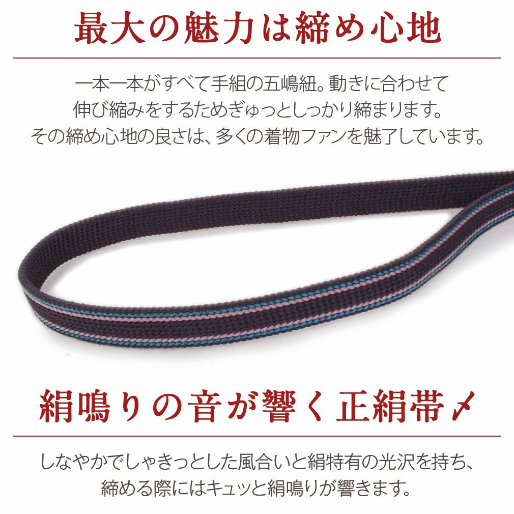 正絹のしなやかでしゃきっとした風合いと絹特有の光沢を持ち、締める際には「キュッキュッ」と心地よい絹鳴りが響きます。