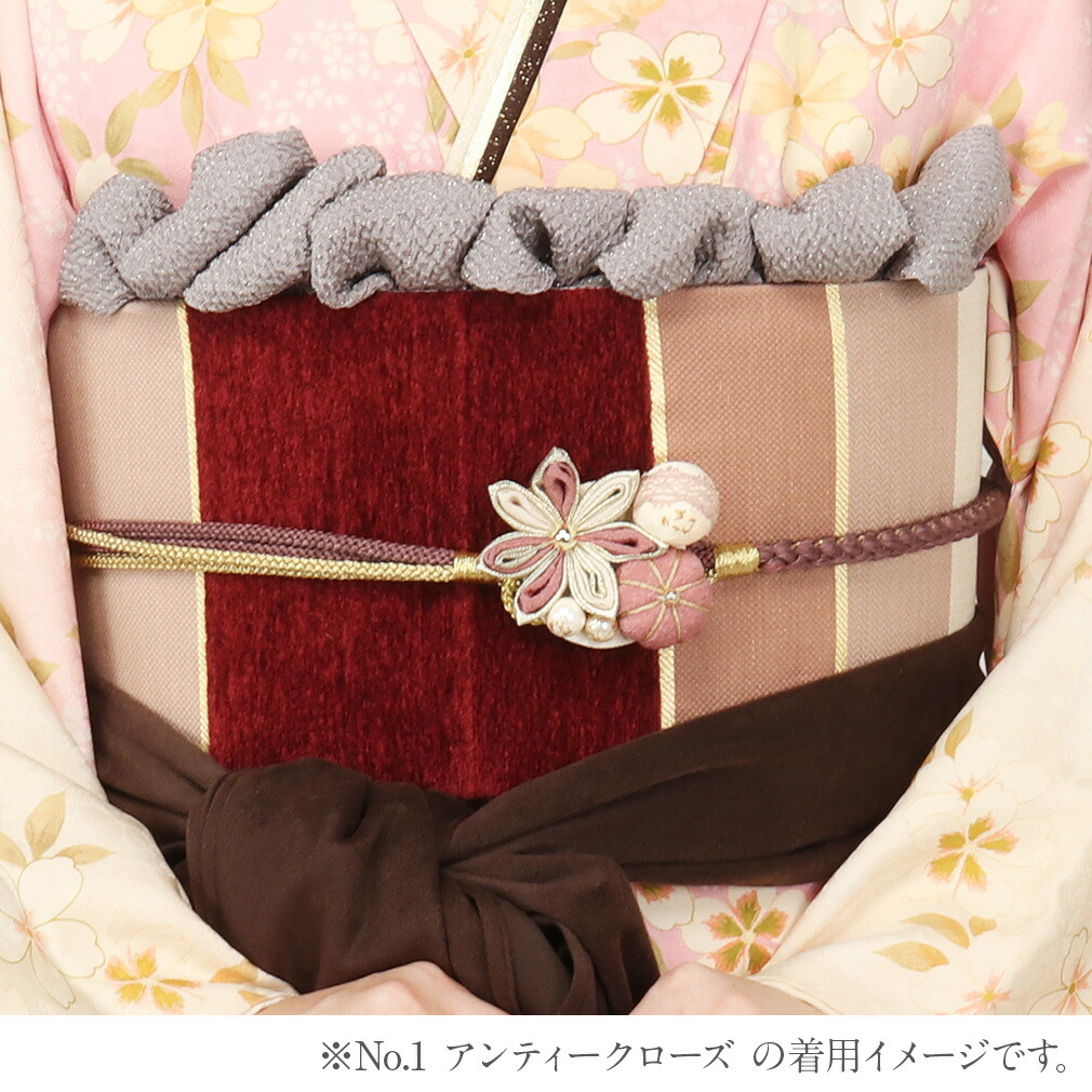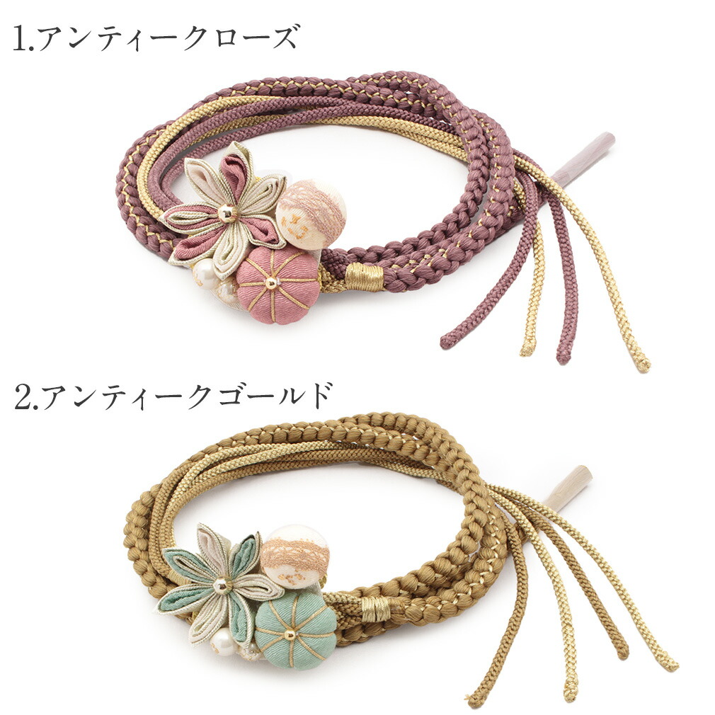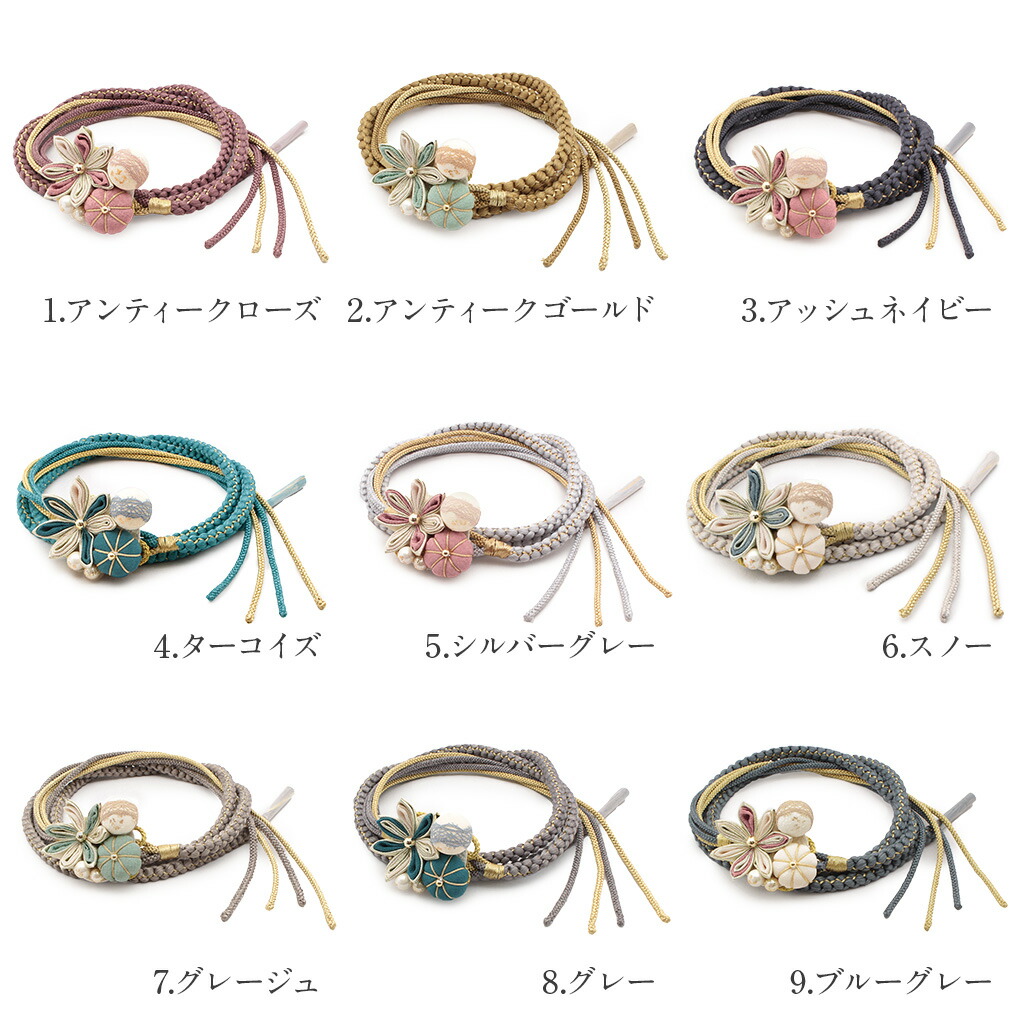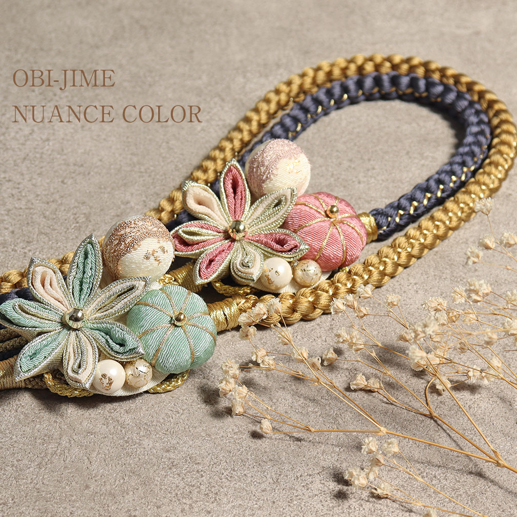 ハレの日をかわいく彩る、くすみカラーの花飾りが施された帯締めです。 剣つまみの細かなつまみ細工の花と、発色の良い丸紐にちりめん素材の梅飾りが、振袖姿を一層華やかに彩ります。 花飾りは、見た目にもボリューム感があり、金箔パールやレース丸玉使いがポイントになります。 花芯やパールの光沢感がモダンなスタイルを演出します。 厚みのある帯締めは存在感があり、着物のコーディネートをぐっとオシャレな装いに。 片側が太い軸、もう片側は細い丸紐をまとめた帯〆はアレンジ結びも楽しめます。 丁寧に組み上げられた繊細な編み目と美しい正絹の光沢が楽しめます。 また、見た目だけでなく実用面でも優れており、締めた時のしっかりとした締まり具合で緩みにくく締めやすく、正絹ならではのぎゅっと響く絹鳴りが心地よい逸品です。 カラーは9色展開。どれも優しい発色で、シックなお着物はもちろん、華やかなお着物にも合わせやすい色味を揃えました。 ビビッドカラーよりも肌なじみがよいニュアンスカラー。 比較的まとう人を選ばないのがのメリットで、優しい印象や大人らしい印象を醸し出してくれるカラーとしても人気が高く、気軽にコーディネートを楽しめます。 振袖はもちろん、普段のコーディネートのアクセントにもぜひオススメです。 お着物の雰囲気やお好みに合わせてお選びくださいませ。