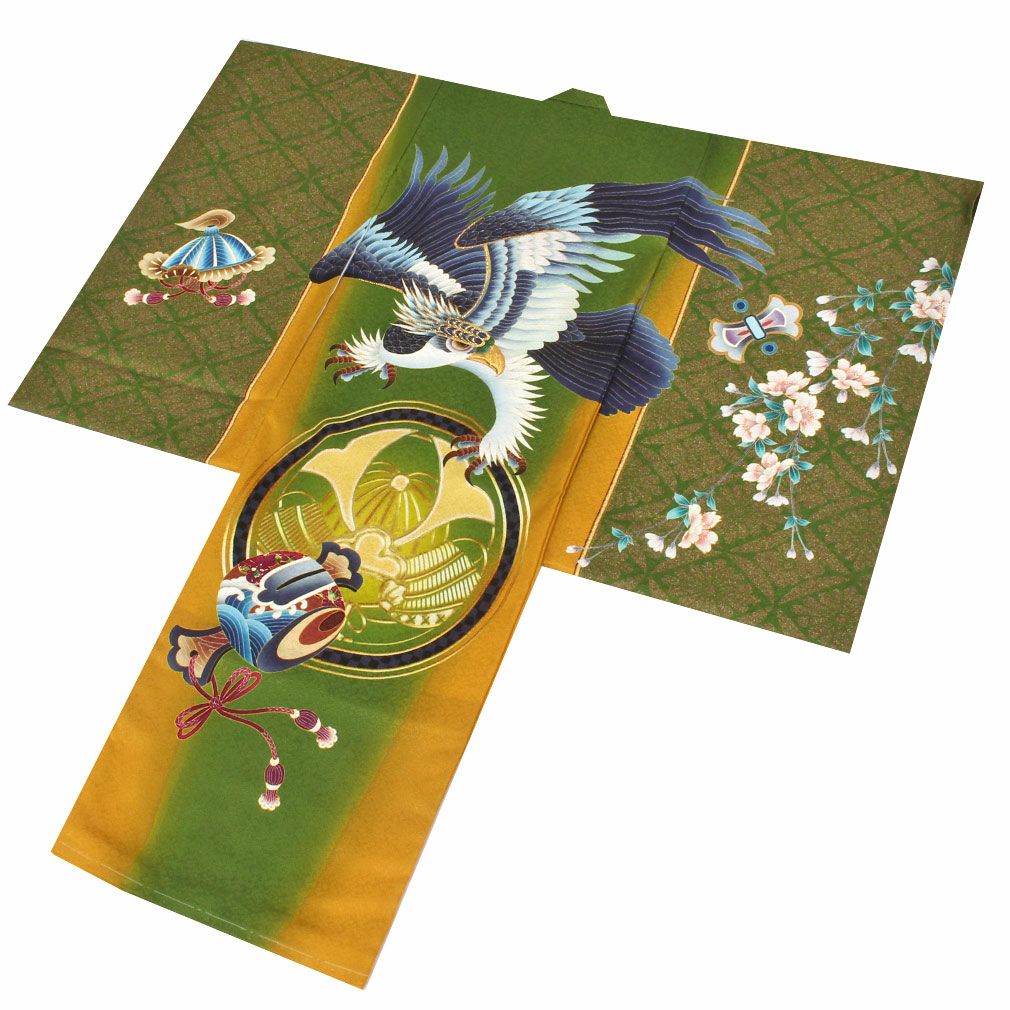 緑色の生地には大きく羽ばたく鷹や兜など、美しい柄付けと金彩の輝きがまるで一つの芸術作品のよう。