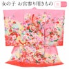 赤ちゃんの誕生を祝い健やかな成長を祈る行事、お宮参りにぴったりの産着です。 女の子の産着には吉祥文様で祝意を示し、雅で優雅な雰囲気の古典柄が多くあしらわれています。 着物全体には牡丹・八重桜などの花々が咲き誇り、女の子らしい優雅で麗らかなデザインが魅力的。 音が"鳴る"ことから実が"なる"ようにと言われる縁起物の鼓や、着物一面の花々がお着物全体を美しく彩ります。 牡丹には美しい刺繍が、柄には金彩の縁取りが施され上品さと華やかさを兼ね備えた逸品です。 表地は絹100%で仕立てておりますので、正絹ならではの柔らかな光沢と滑らかな肌触りが感じられます。 ご姉妹での着用や、肩・腰上げをすることで七五三にもお使いいただけます。 生まれて初めてのお着物にお勧めの逸品、ぜひ手に取ってお楽しみくださいませ。