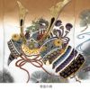 上品な気品感じられる茶色の生地に、豪華な刺繍や金彩を施した兜が堂々と描かれています。