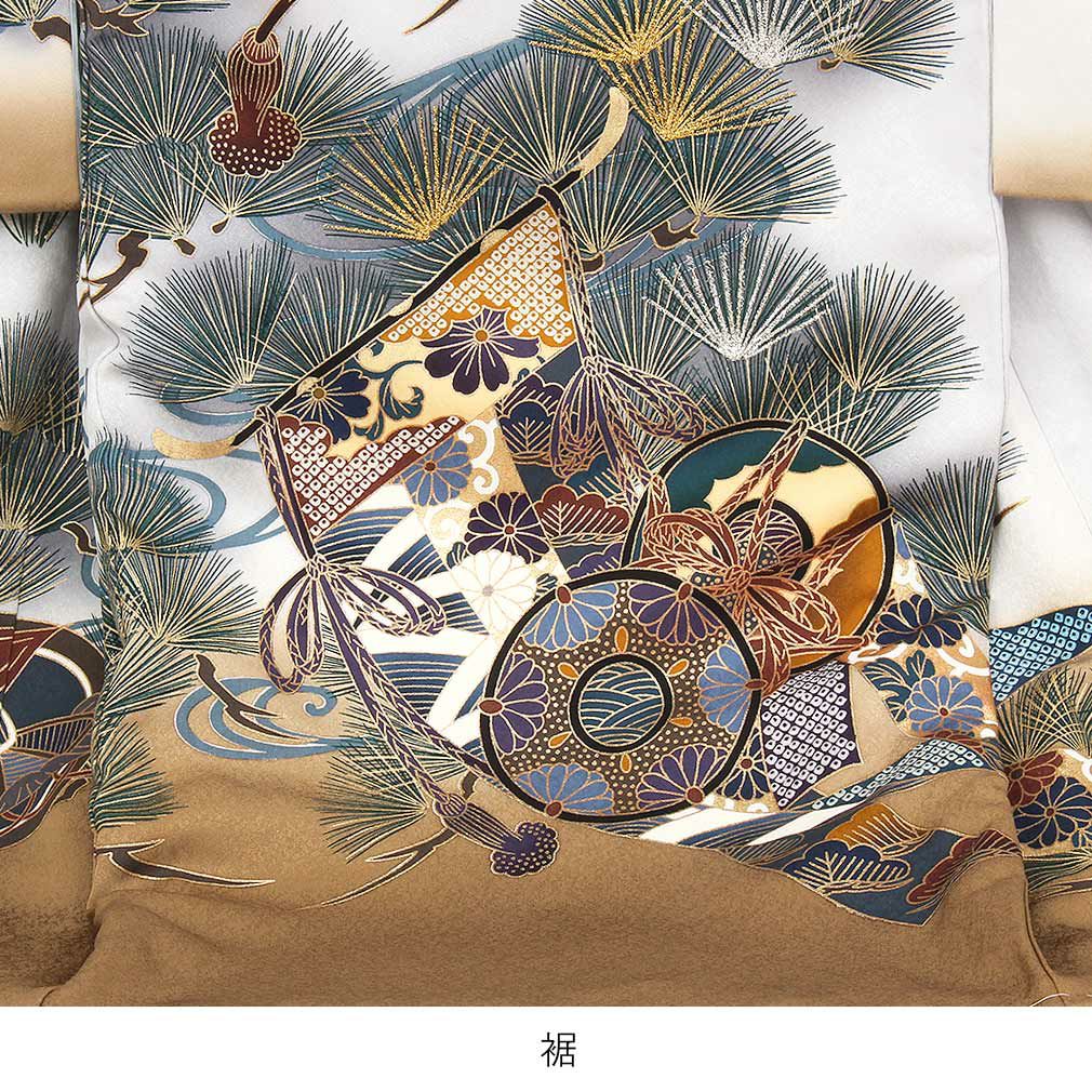 裾に描かれた几帳や鼓には、縁起のよいとされる吉祥文様が所狭しと描かれており、お子様の繁栄や成長を願います。