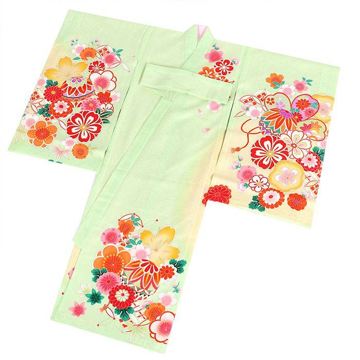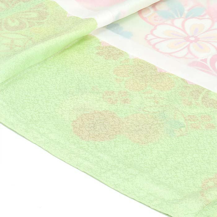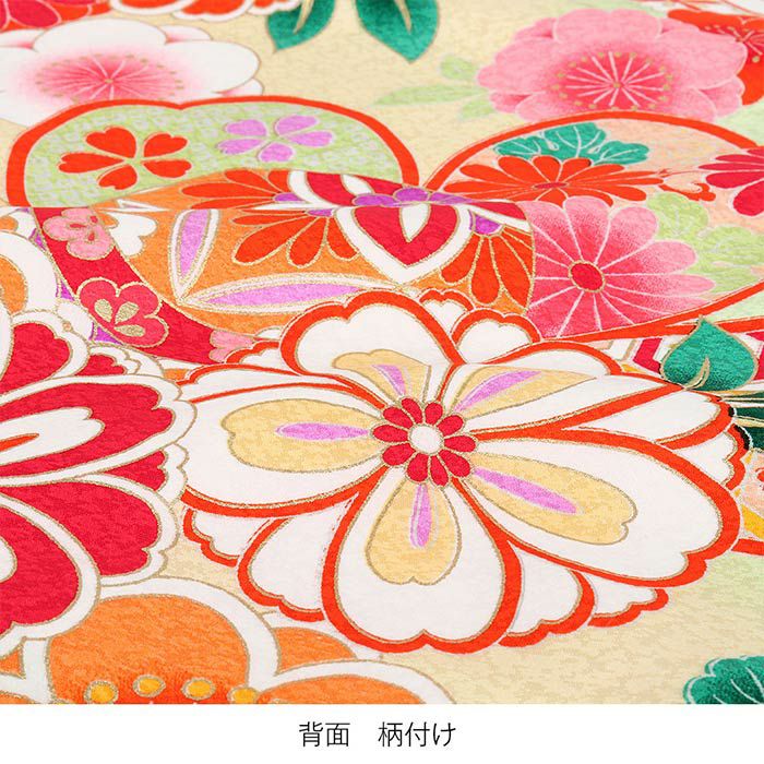 流れるような斜めぼかしに金彩が浮かび上がり、着物一面に描かれた花々と共にハレの日を美しく彩ります。