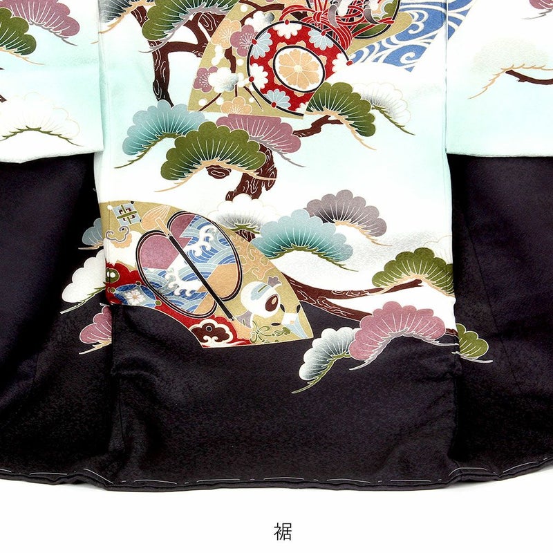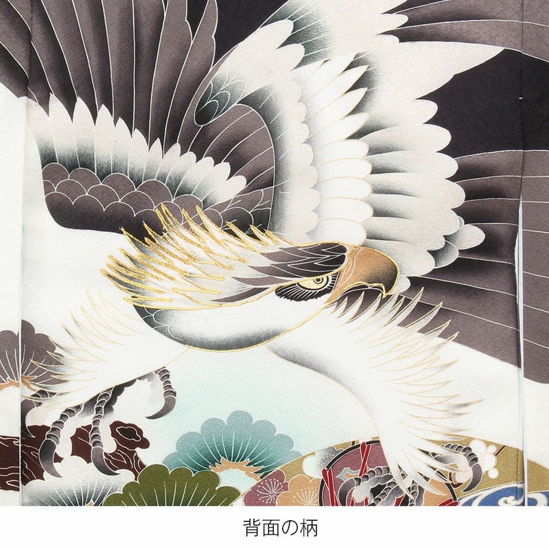 大きく羽ばたく鷹に、金彩で彩られた扇の中に堤太鼓や軍配などの宝尽くしが描かれた柄ゆきが豪華で男の子らしい装いです。
