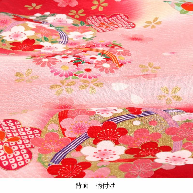ピンク味かかった赤色が可愛らしい生地には高級感のある地模様が入り、光の加減でふわりと浮かび上がる文様がお着物全体を美しく引き立てます。