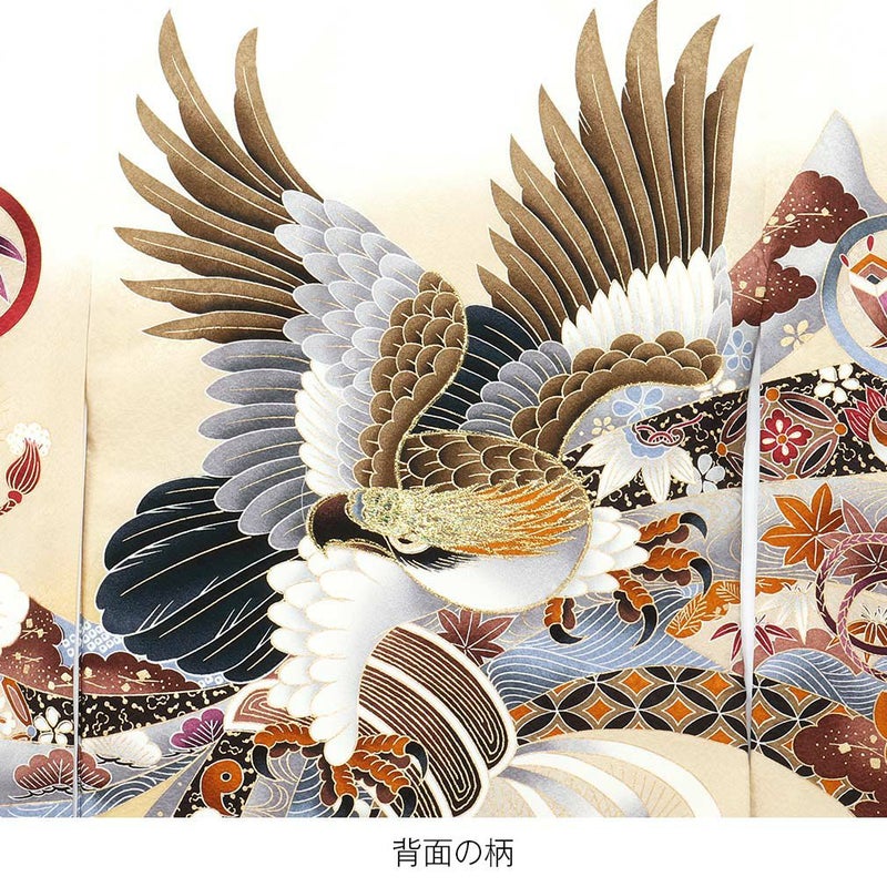 大きく羽ばたく鷹に、小槌や軍配などが美しく描かれ、重厚感と勇ましさが感じられるデザインが特徴的。