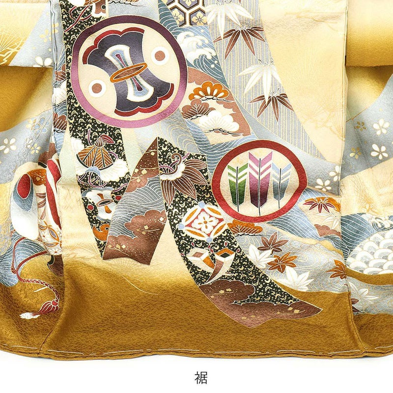 兜の上の龍には美しい緑色のラメ糸で刺繍が施され、着物の柄全体には金彩が施されるなど高級感と荘厳さをお楽しみいただけます。