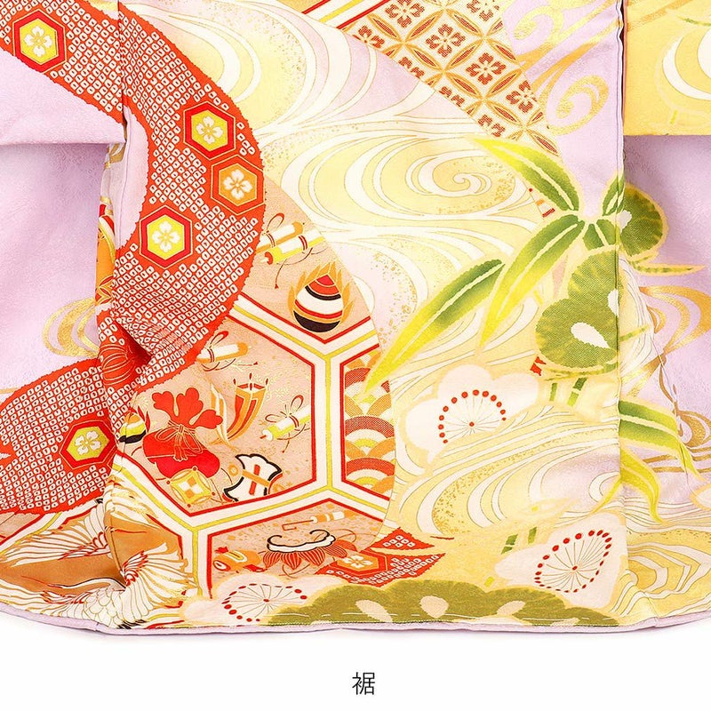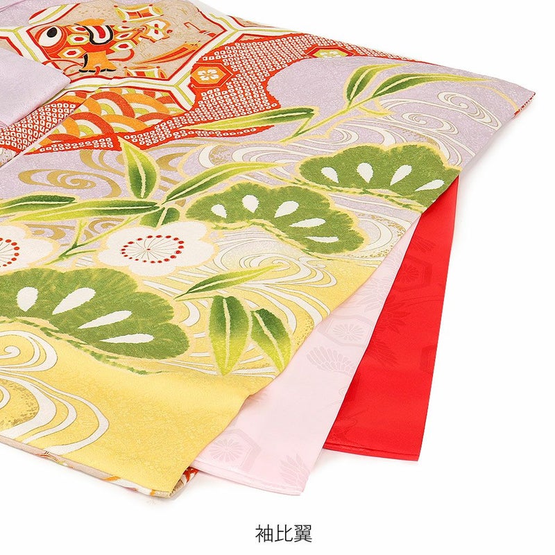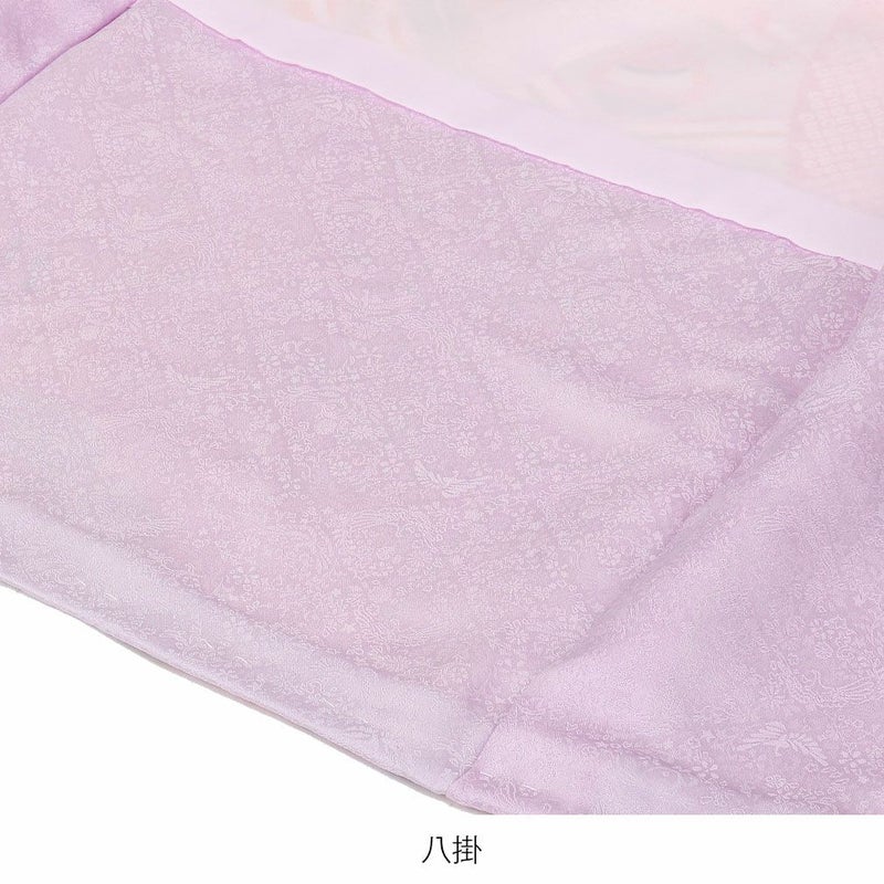 宝尽くし紋様や亀甲、流水模様などのおめでたい柄に金駒刺繍の美しい対い鶴、打出の小槌などの縁起良く麗らかで女の子らしいデザインです。