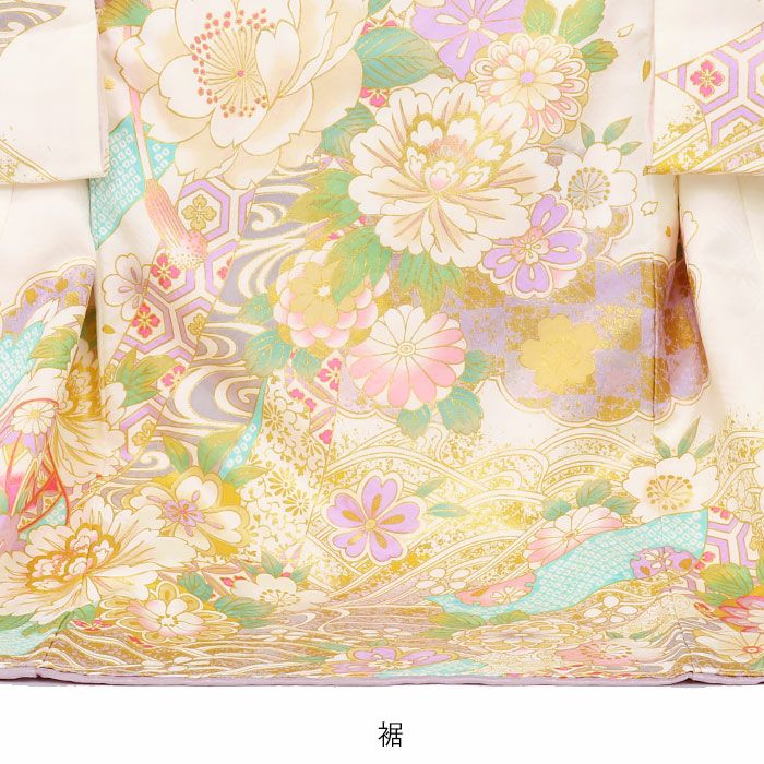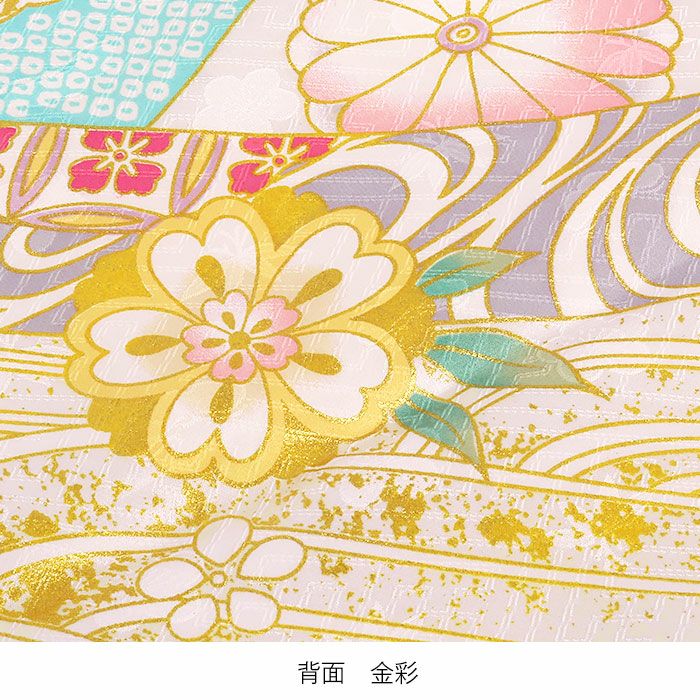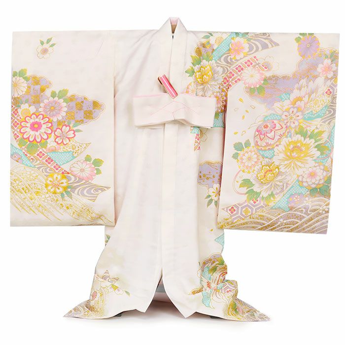 鹿の子紋様や七宝 流水などのおめでたい柄に花々が華を添える牡丹や万寿菊、桜などの日本の花々を乗せた麗らかで女の子らしいデザイン。