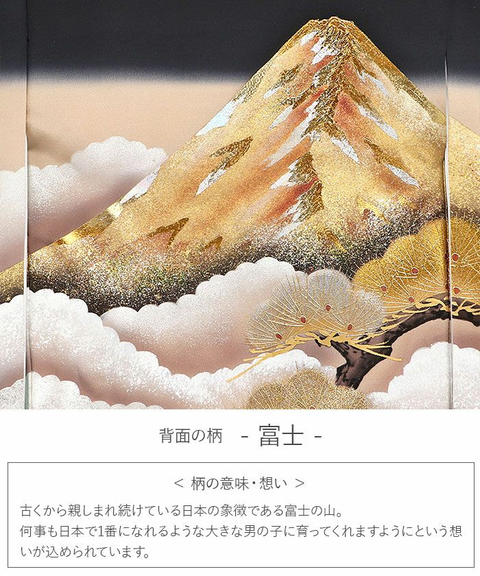 日本の象徴ともいえる富士山をメインに松や雲などが美しく描かれた、重厚感と勇ましさが感じられる柄ゆき。