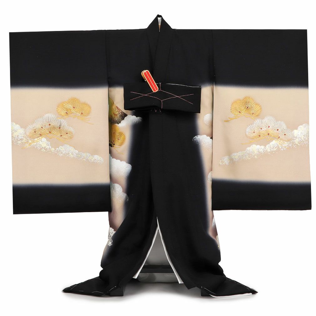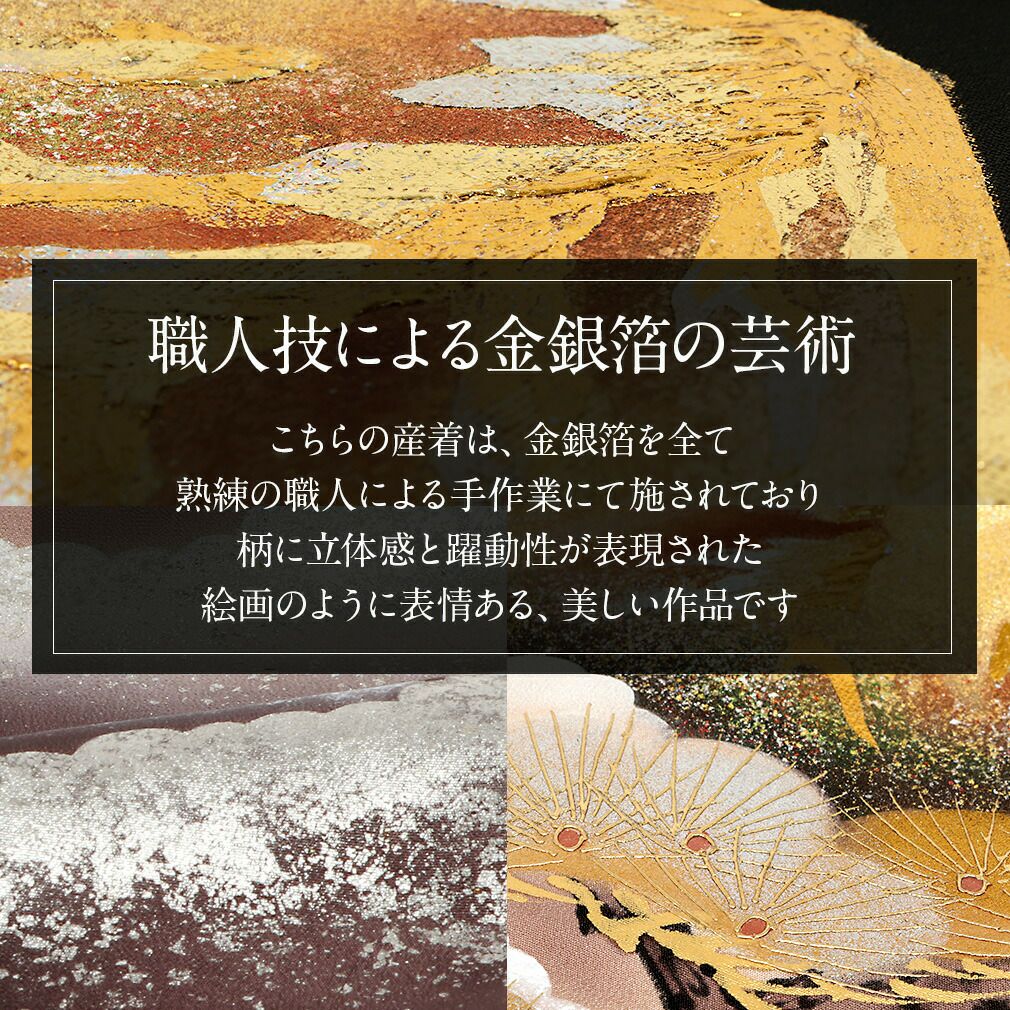 金彩で描かれた松の葉には、細やかなラメが施され、浮き出るような見た目の豪華さが楽しめます。