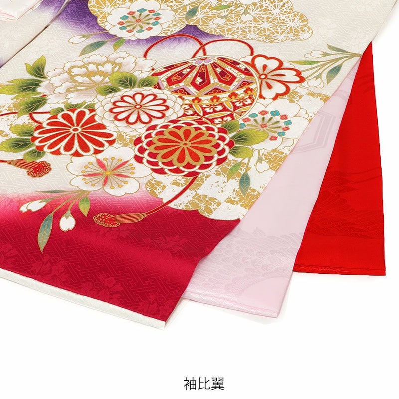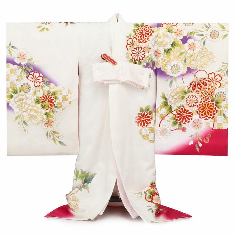 白色から紫、赤のグラデーションが施された色彩豊かな地色の着物には地紋が入り、光の加減で上品な模様がふわりと美しく浮かび上がります。