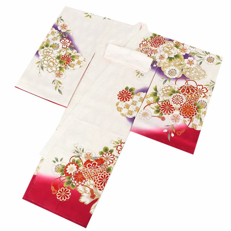 亀甲紋様や七宝などのおめでたい柄に花々が華を添える鞠や万寿菊、桜などの日本の花々を乗せた麗らかで女の子らしいデザイン。