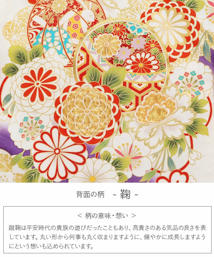 「どんな困難が起きても何事も丸く収まりますように」「丸々と健やかに成長しすように」という願いも込められている鞠を始め、人との調和やご縁を願う七宝紋や長寿を願う亀甲紋など、お子様の活躍や成長の願う親心が込められています。