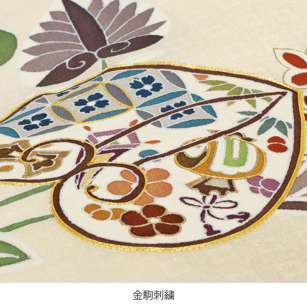 葵の縁取りには金駒刺繍が施され、ふっくらとした質感や、煌びやかな輝きが黒地に映える豪華な意匠。