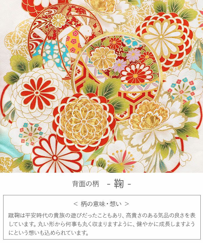 「どんな困難が起きても何事も丸く収まりますように」「丸々と健やかに成長しすように」という願いも込められている鞠を始め、人との調和やご縁を願う七宝紋や長寿を願う亀甲紋など、お子様の活躍や成長の願う親心が込められています。