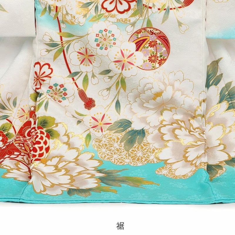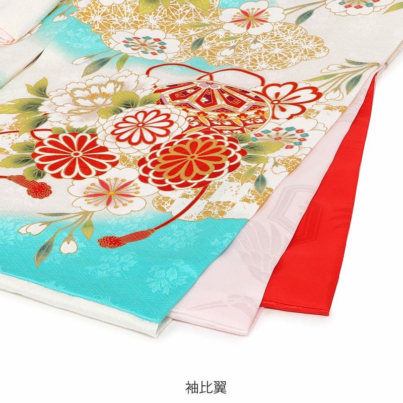 亀甲紋様や七宝などのおめでたい柄に花々が華を添える鞠や万寿菊、桜などの日本の花々を乗せた麗らかで女の子らしいデザイン。