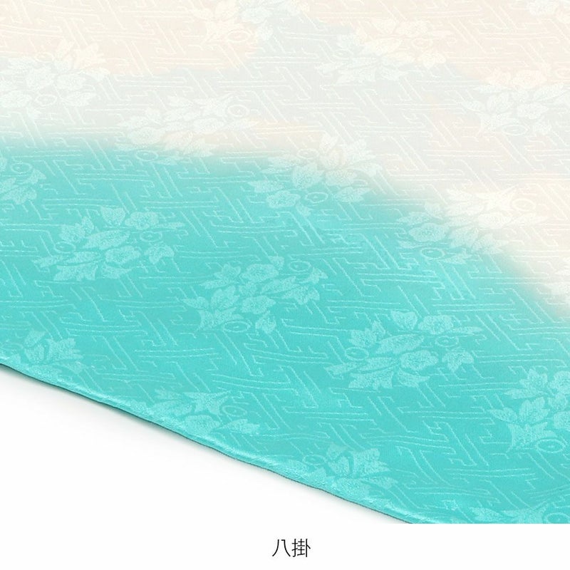 白色から水色のグラデーションが施された色彩豊かな地色の着物には地紋が入り、光の加減で上品な模様がふわりと美しく浮かび上がります。