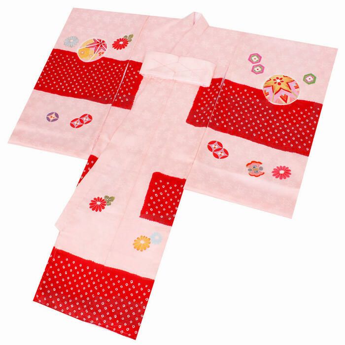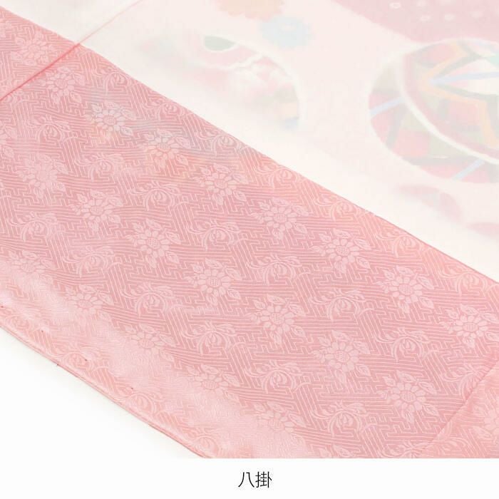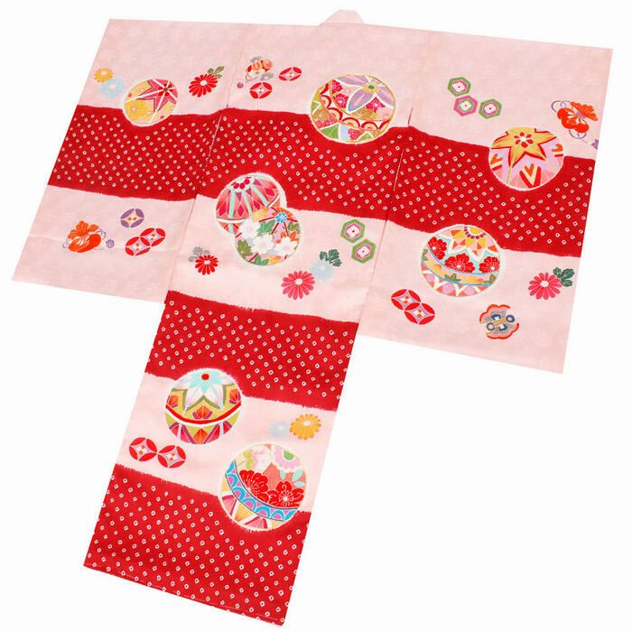 色とりどりの鞠に、小槌などの宝尽くし紋や菊などの吉祥花が咲き誇る、麗らかで女の子らしいデザイン。