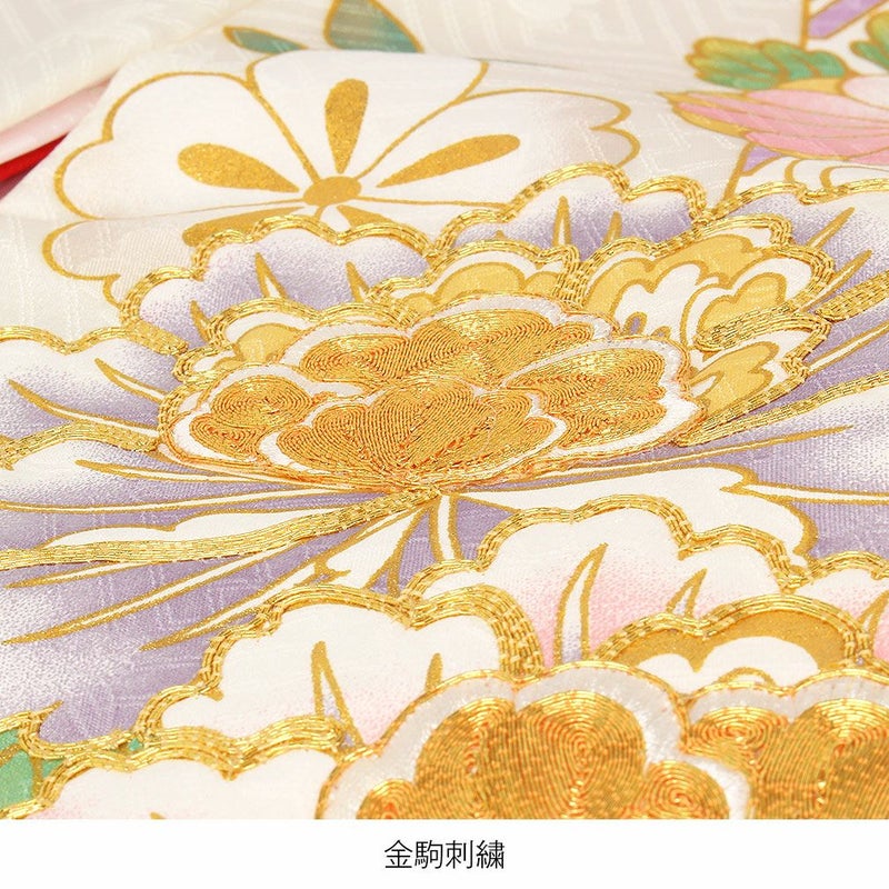 鞠の縁取りや牡丹の花びらには職人による丁寧な金駒刺繍が施され、ふっくらとした質感や、煌びやかな輝きが映える豪華な意匠。