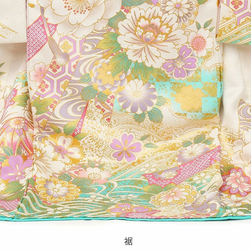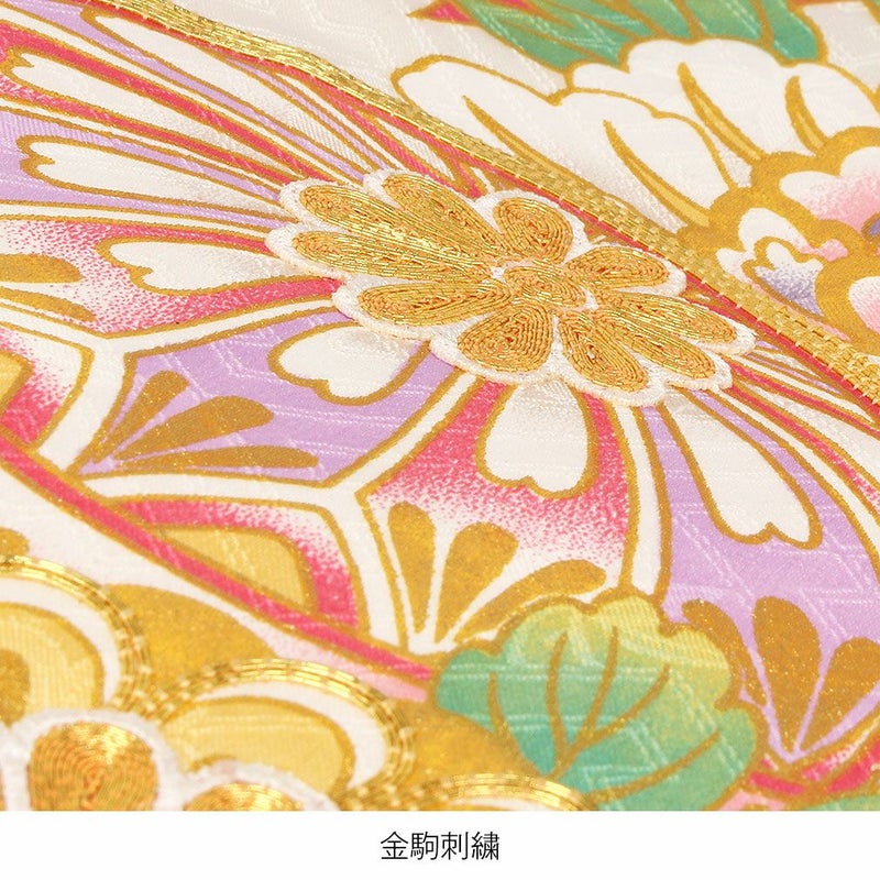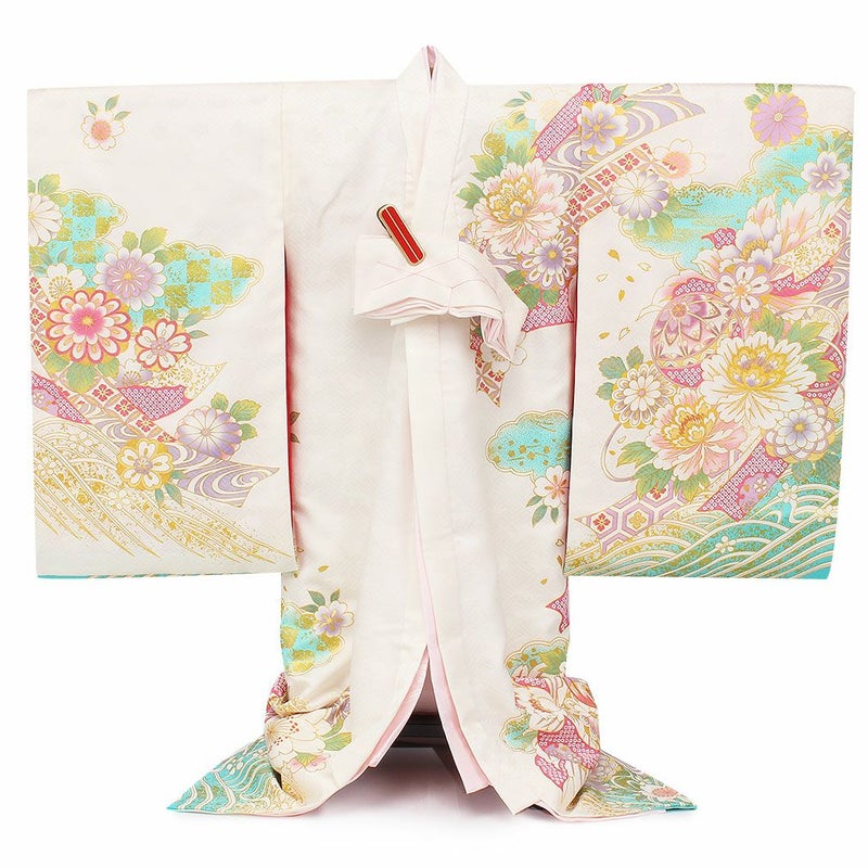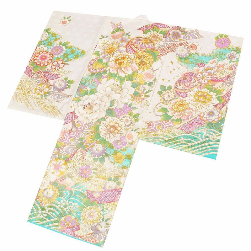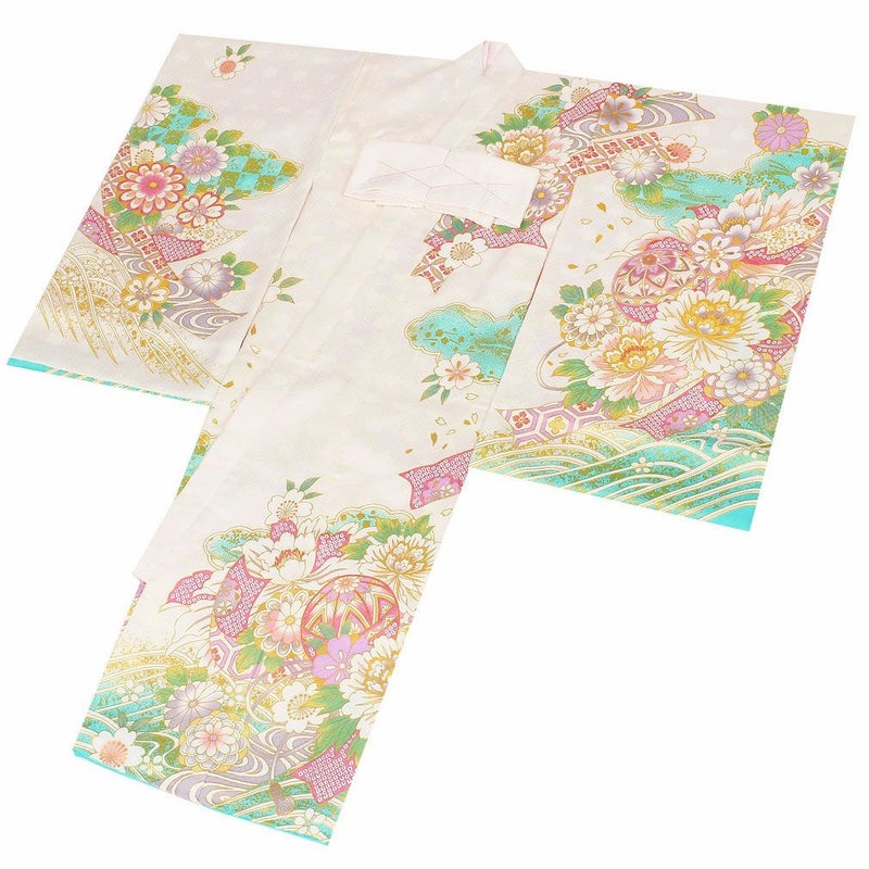 色とりどりの鞠の周りに、牡丹や桜などの吉祥花が咲き誇る麗らかで女の子らしいデザイン。