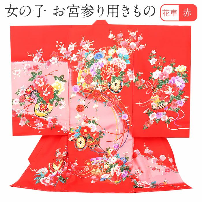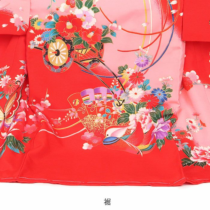 色鮮やかな牡丹を乗せた花車を始め、蝶が舞う様などが描かれた、麗らかで女の子らしいデザイン。