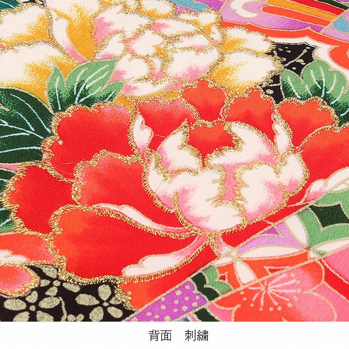 中央に描かれた牡丹には金糸で刺繍が施され、ふっくらとした質感や煌びやかな輝きが映える豪華な意匠。