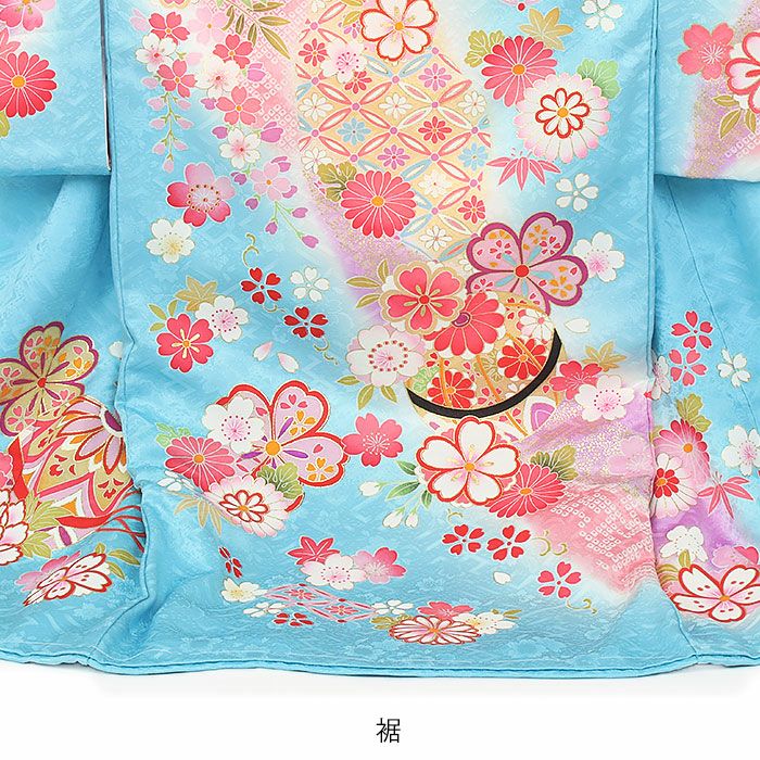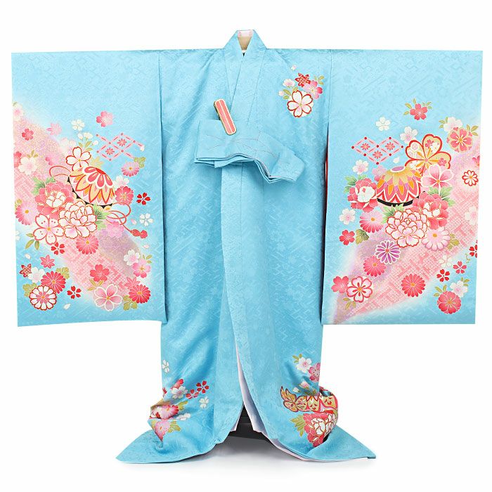流れるような斜めぼかしに金彩が浮かび上がり、着物一面に描かれた花々と共にハレの日を美しく彩ります。