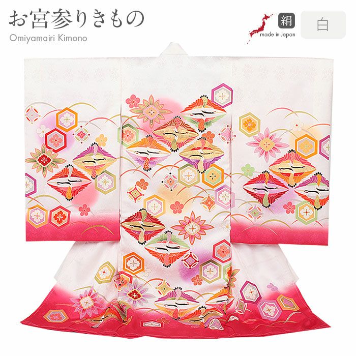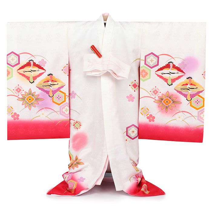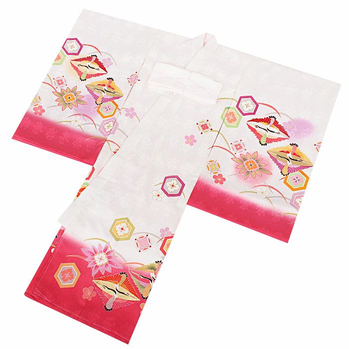 色鮮やかな向かい鶴菱紋を始め、露芝や梅紋が花を添える、麗らかで女の子らしいデザイン。