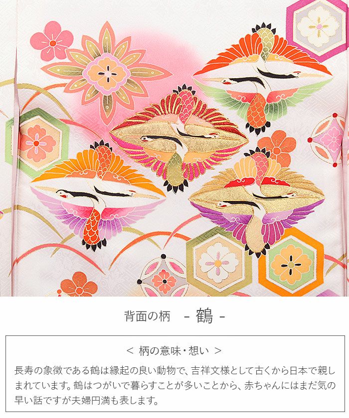 菱文の有職文様と組み合わせた鶴は、鶴だけの物に比べ格式が高い柄ゆきとされ、初めてのお祝いに相応しい意匠。