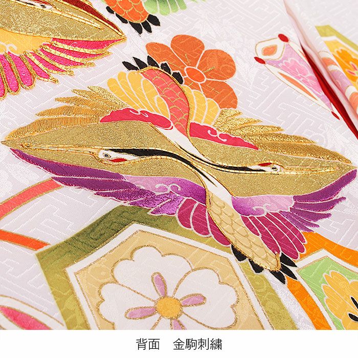 鶴の羽や縁取りには、職人による丁寧な金駒刺繍が施され、ふっくらとした質感や煌びやかな輝きが映える豪華な意匠。