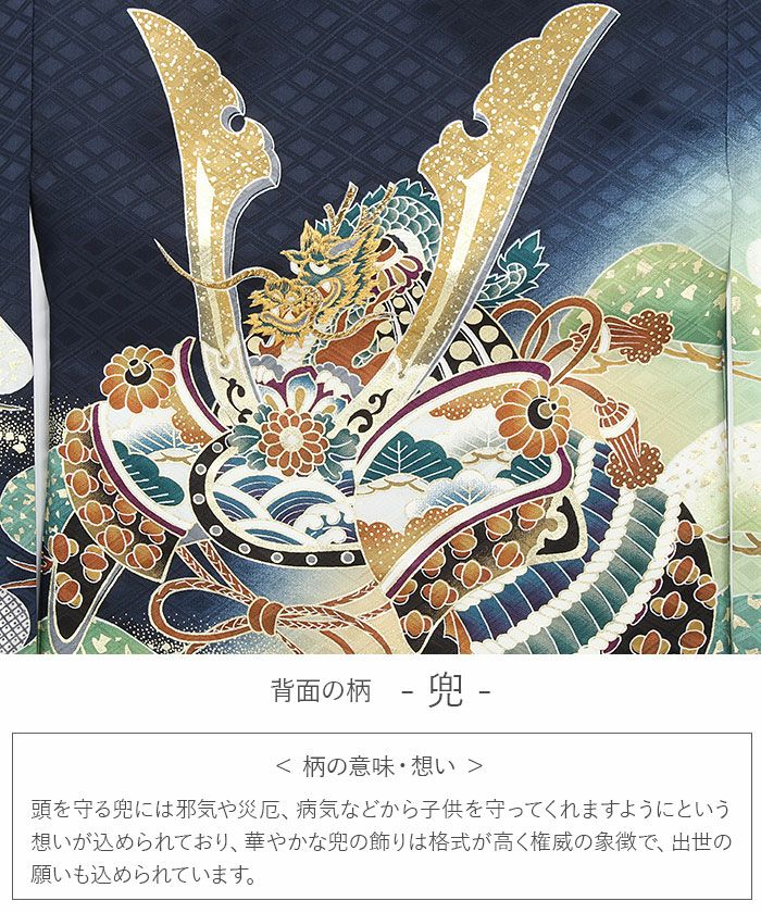 男の子用は勇ましさや出世、大成を意味する柄が描かれ、落ち着いた色を基調とした男の子らしい装いです。