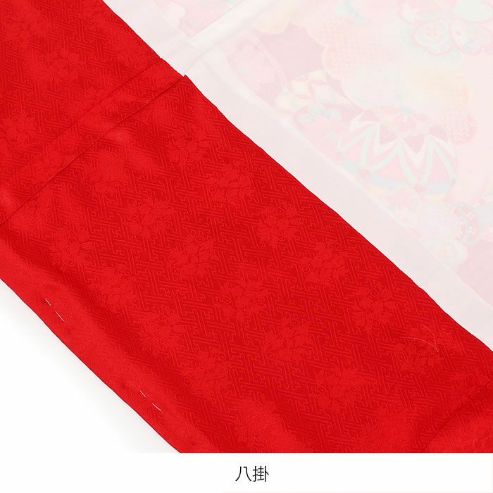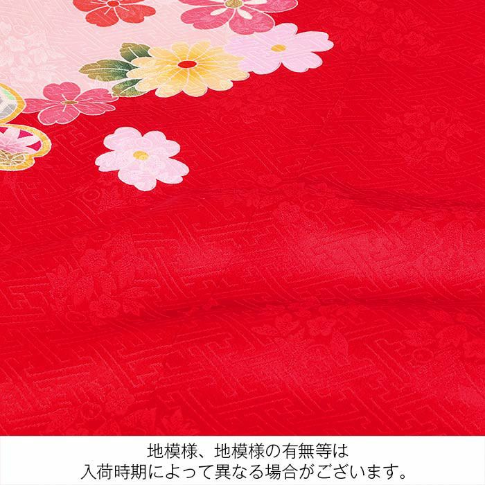 色鮮やかな赤色の着物には地紋がはいり、光の加減で上品な模様がふわりと美しく浮かび上がります。
