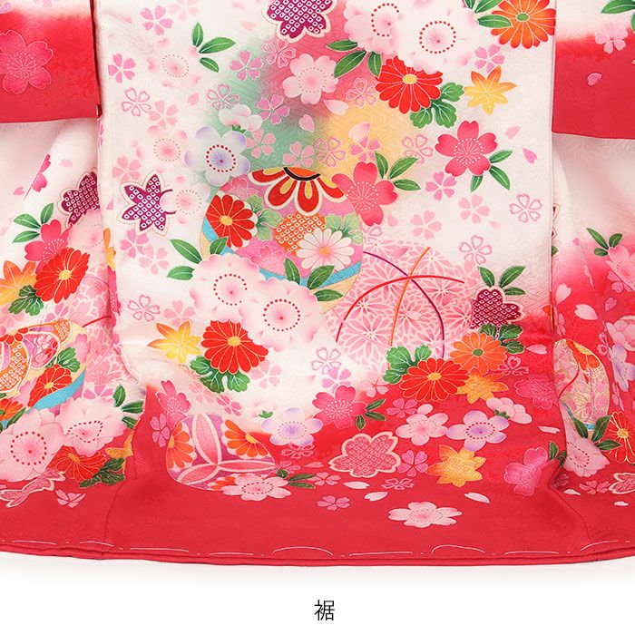 丸々大きく育つようにと願いが込められた鞠を始め、万寿菊や桜などの吉祥花が咲き誇る麗らかで女の子らしいデザイン。