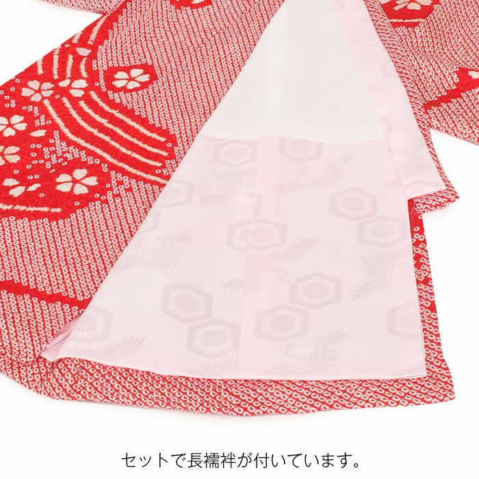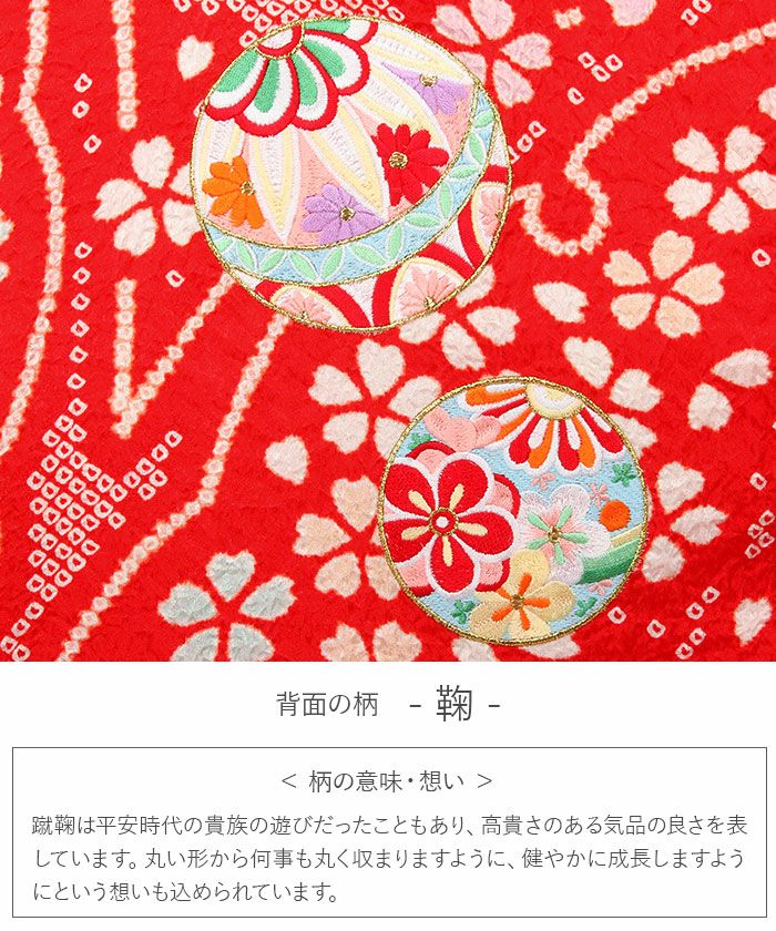 赤と白の美しい配色に、鹿の子絞りや、豪華な刺繍の鞠、絞りの桜が華やかで上品な印象を与えます。