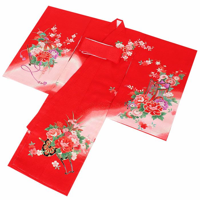 色鮮やかな牡丹に彩られた扇や鞠を始め、梅や万寿菊などの吉祥花が咲き誇る、麗らかで女の子らしいデザイン。