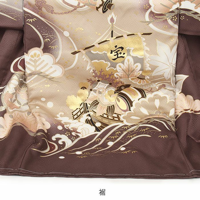 宝船の帆や柄の縁取りは金彩が施され、立体感のある煌びやかな輝きがお着物全体を美しく引き立てます。