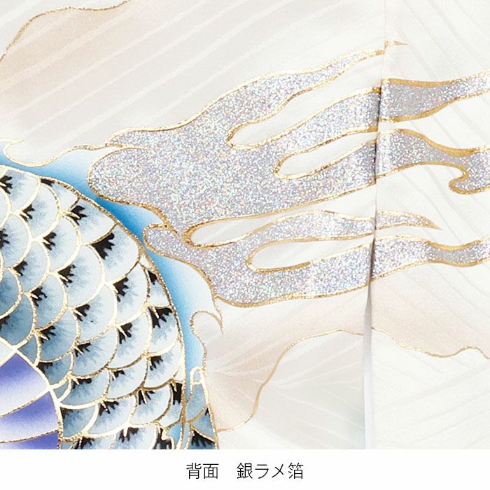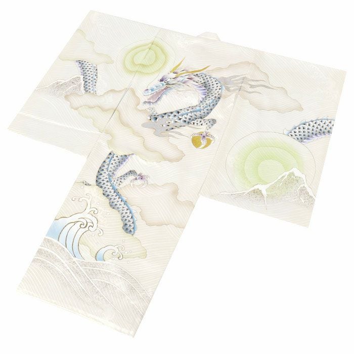 龍の髭や縁取り、鱗の縁取りには金彩が、山々にはオーロラ箔が施され、立体感のある煌びやかな輝きが白地に映える豪華な意匠。