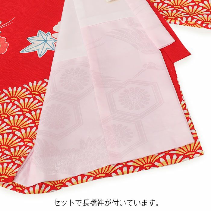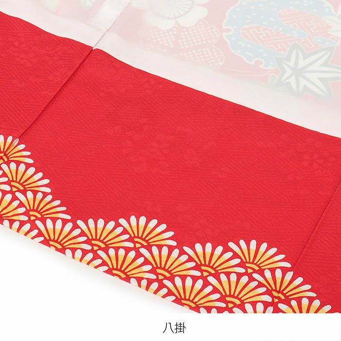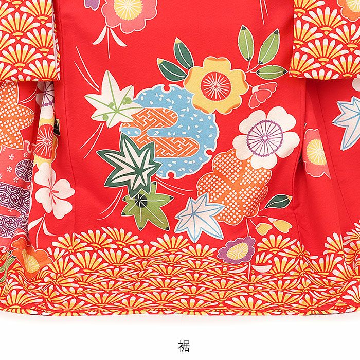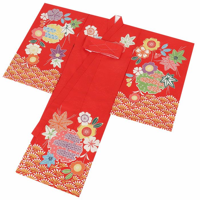 色鮮やかに描かれた桜や紅葉を始め、雪輪に籠目などの吉祥紋が描かれた麗らかで女の子らしいデザイン。