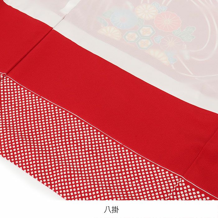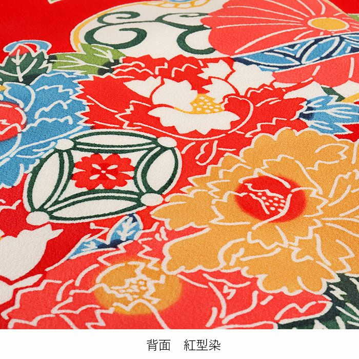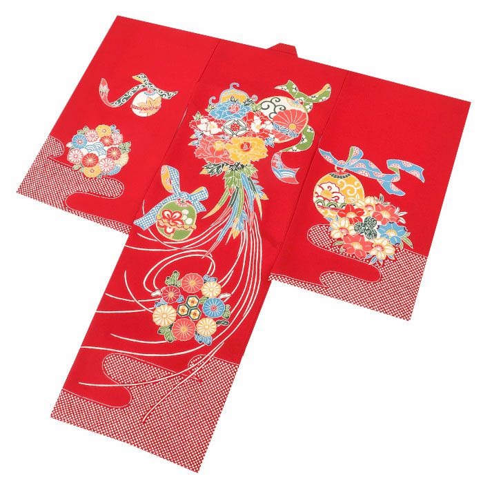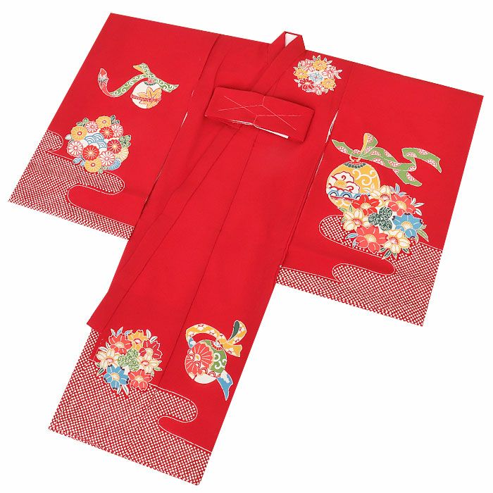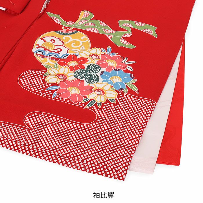 色鮮やかに描かれた花籠や鈴飾りを始め、牡丹や疋田などの吉祥紋が描かれた麗らかで女の子らしいデザイン。