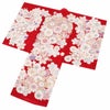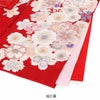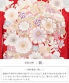 濃赤色に淡い色合いの鞠や花扇、牡丹や桜などの吉祥花は、存在感がありハレの日に相応しい華やぎの意匠。