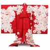 色鮮やかな赤色の着物には地紋がはいり、光の加減で上品な模様がふわりと美しく浮かび上がります。